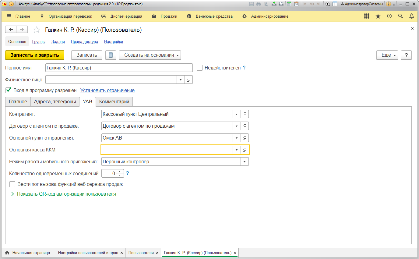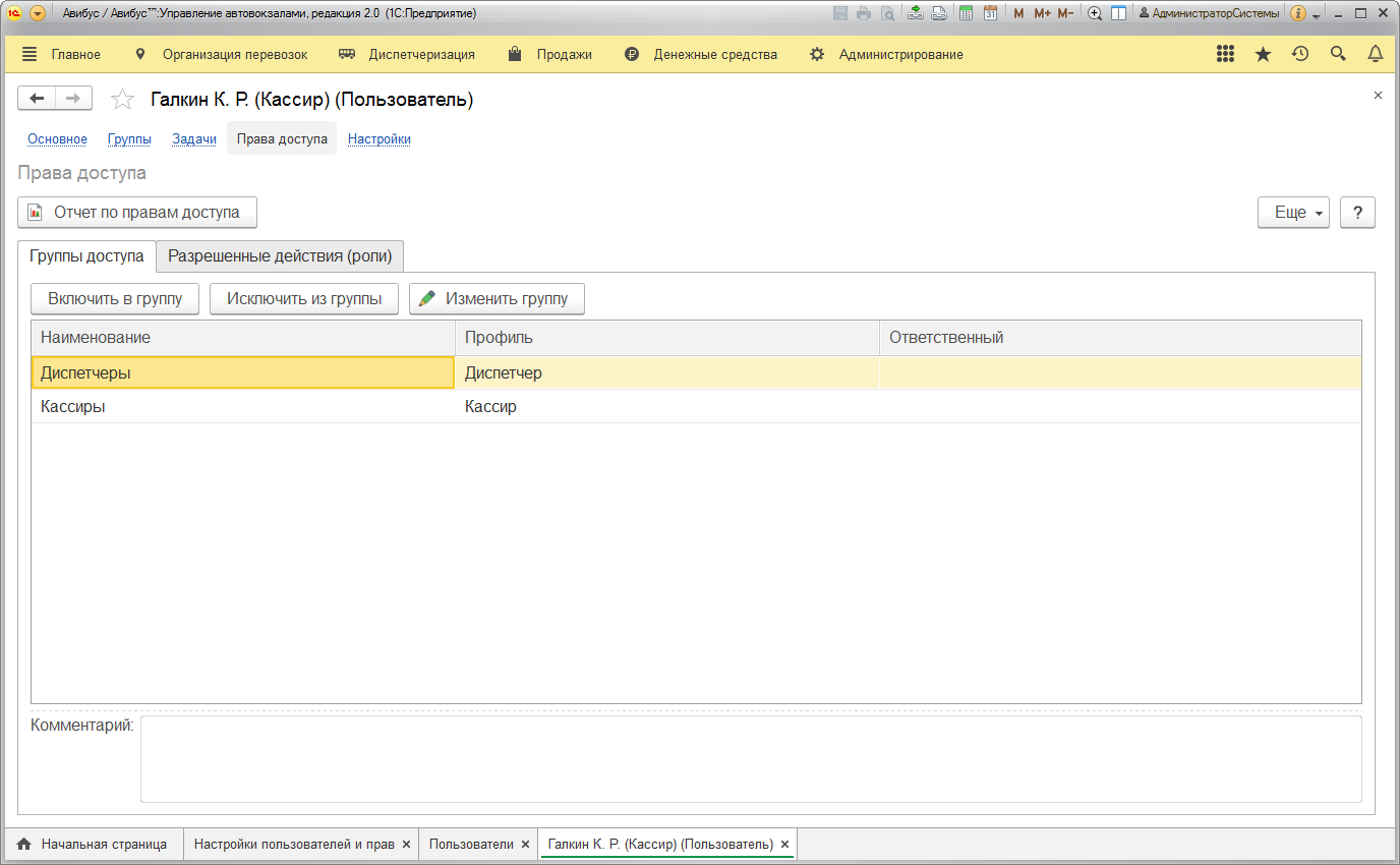 Запишите внесенные изменения, кликнув по кнопке Записать, и перейдите по ссылке к Правам доступа. Включите текущего пользователя в группы Кассиры и Диспетчеры.