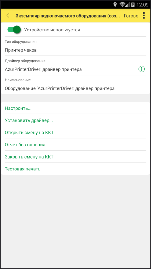 4. Установите переключатель в положение «Устройство используется». Укажите Тип оборудования , а в поле ниже укажите Драйвер оборудования . Поле Наименование заполниться автоматически. Например, если вы настраиваете приложение на мобильной кассе Azur Pos, создайте следующие типы оборудования: