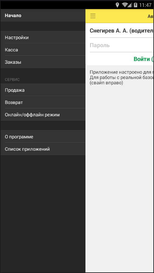 При первом запуске приложения необходимо указать адрес сервера данных, на котором хранится информационная база перевозчика, настроить интеграцию с подключаемым оборудованием и указать используемую систему налогообложения.