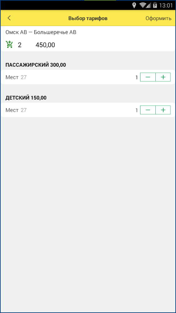 Укажите количество билетов соответствующих видов тарифов в заказе и нажмите кнопку Оформить.