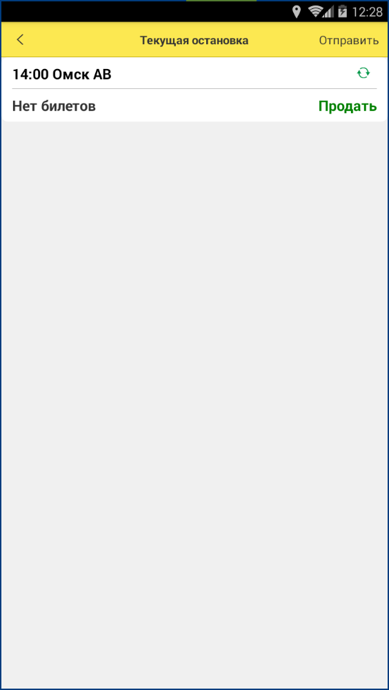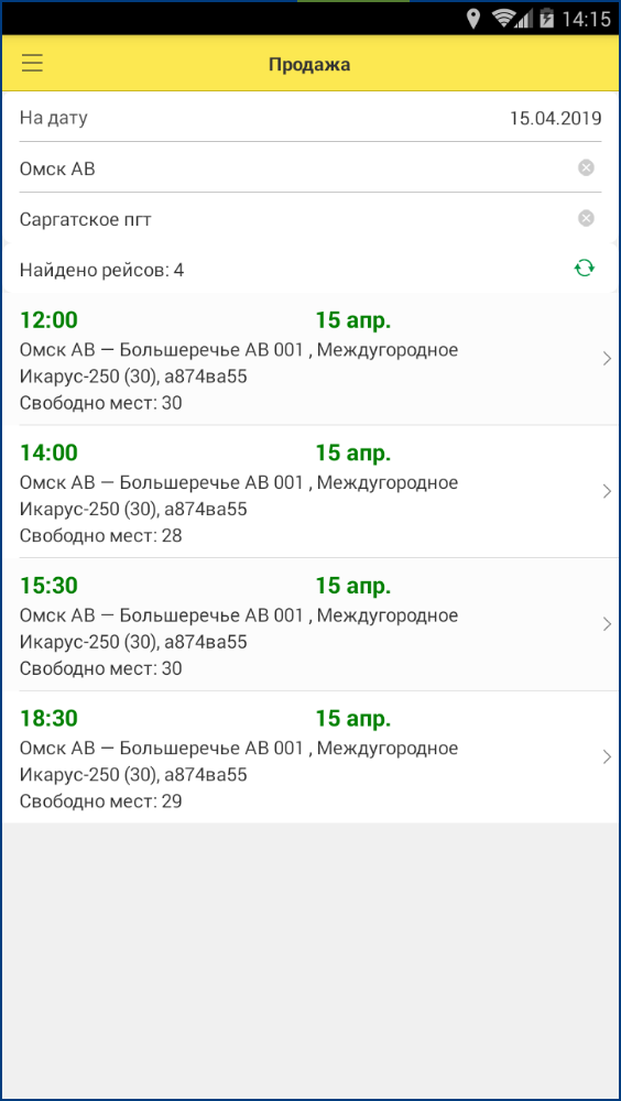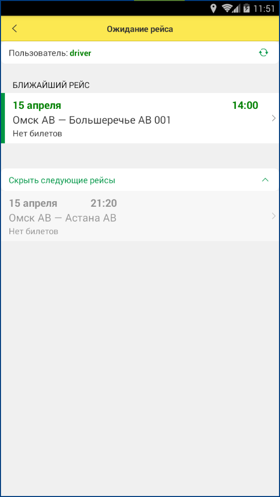 После запуска в приложении в хронологическом порядке отобразится список рейсов, на которые назначен водитель на текущую дату. Также указана основная информация о рейсе: дата и время, маршрут следования и текущее количество проданных билетов.