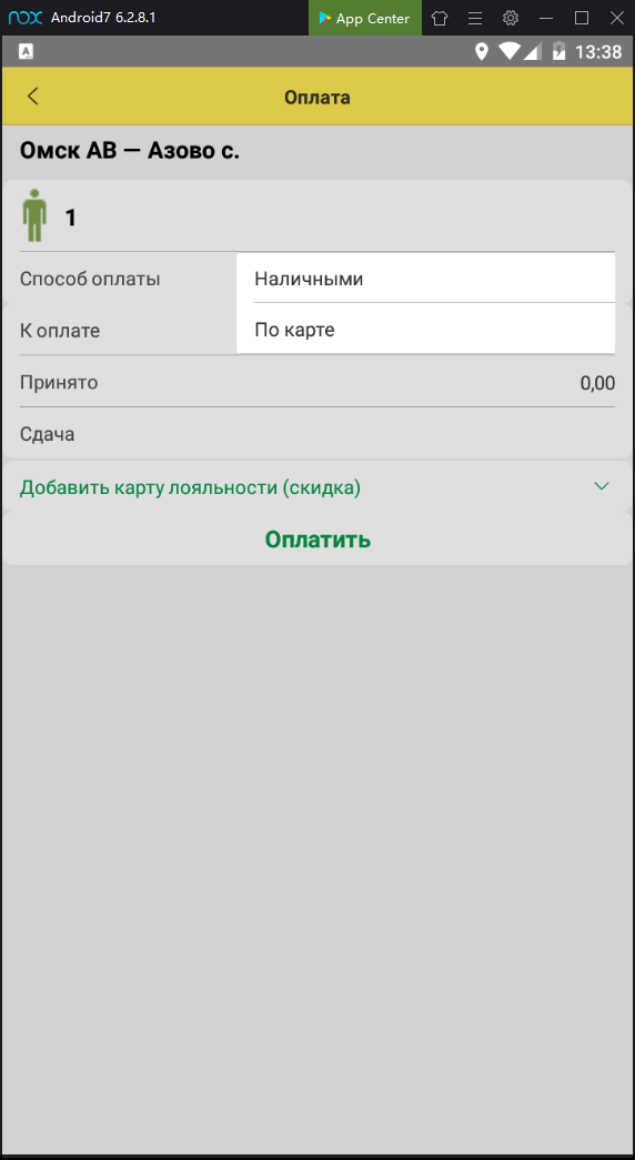 Приложение позволяет производить оплату двумя способами: Наличными или По карте, но если не подключено оборудование для приема безналичных платежей, то доступен только один способ – Наличными.