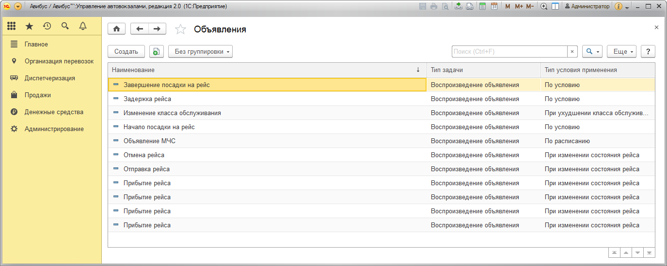 По умолчанию в подсистеме определены три объявления с типом условия применения При изменении состояния рейса: Прибытие рейса, Отправка рейса и Отмена рейса.