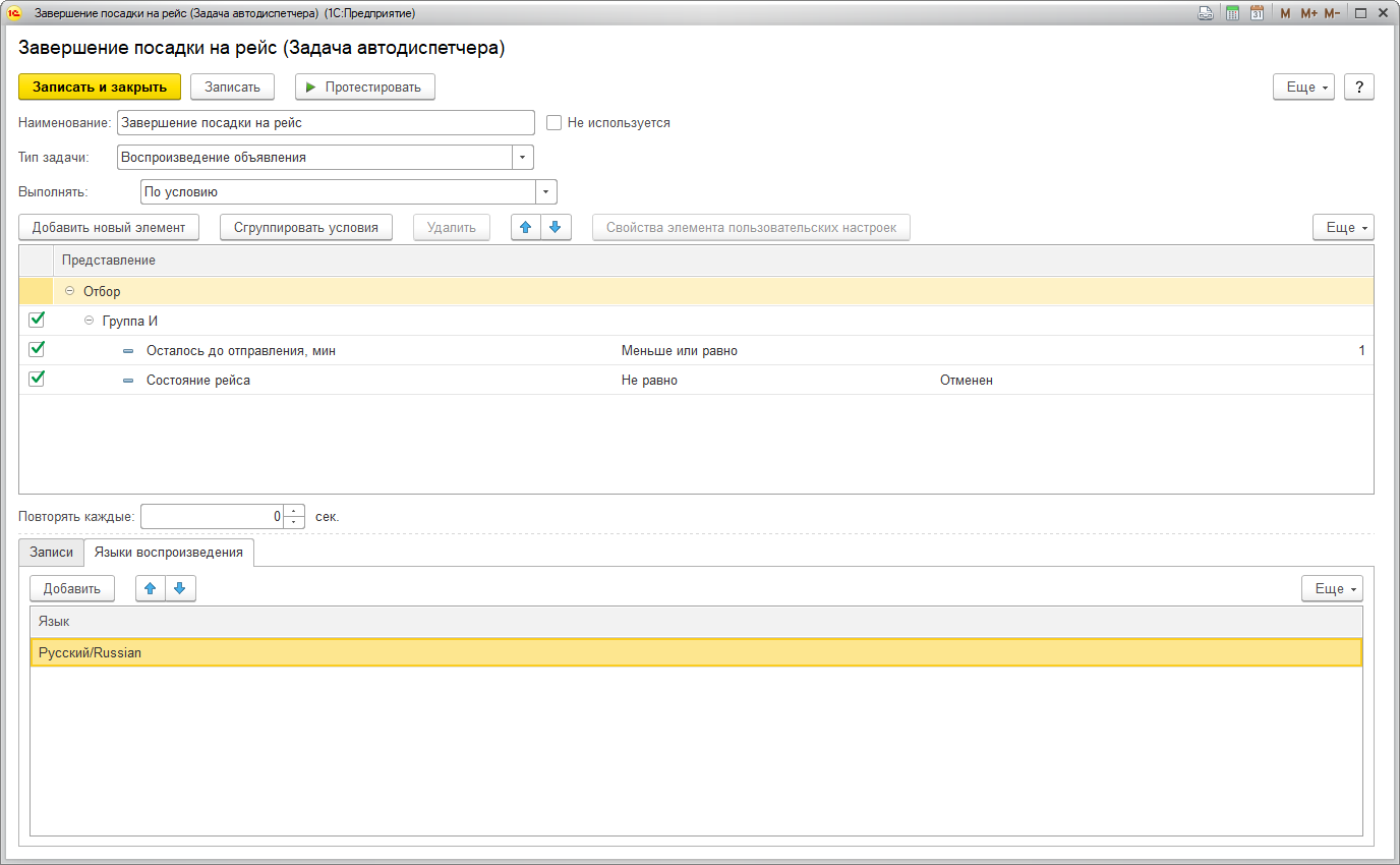 Для объявления Задержка рейса можно установить значение параметра равным 600 секунд: если рейс задерживается, объявление будет повторяться каждые 10 минут.