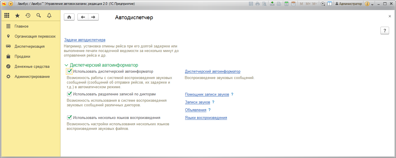 • Диспетчерский автоинформатор – функционал системы для воспроизведения звуковых объявлений. Он включает в себя Помощник записи звуков, Записи звуков, Объявления и Языки воспроизведения.