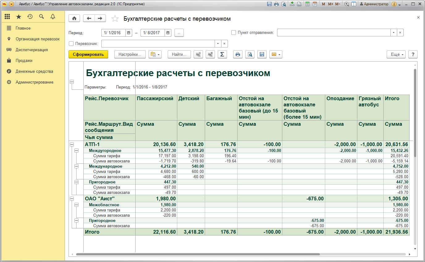 В отчете Бухгалтерские расчеты с перевозчиком отображается информация по стоимости тарифов, услуг, а также информация по вознаграждениям автовокзала в разрезе перевозчиков и видов сообщения: