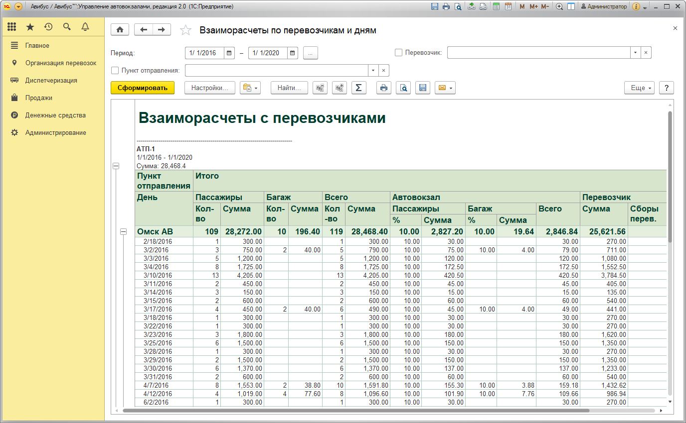 В отчете Взаиморасчеты по перевозчикам и дням отображается информация по стоимости тарифов, а также информация по вознаграждениям автовокзала в разрезе пунктов отправления и дат. Также в отчете отражается информация по предоставленным льготам.