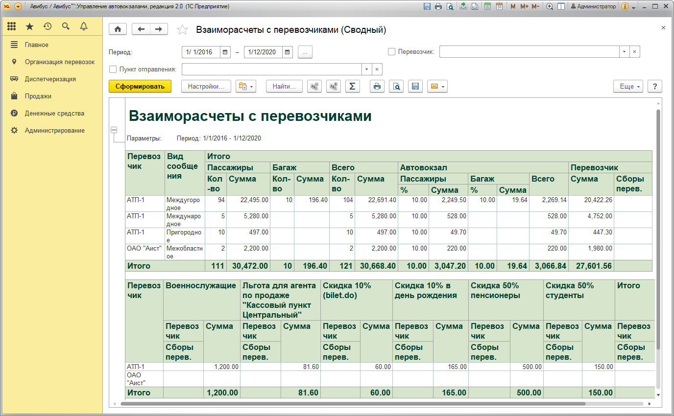 В отчете Взаиморасчеты с перевозчиками (Сводный) отображается информация по стоимости тарифов, а также информация по вознаграждениям автовокзала в разрезе перевозчиков и видов сообщения. Также в данном отчете отражается информация по предоставленным льготам.