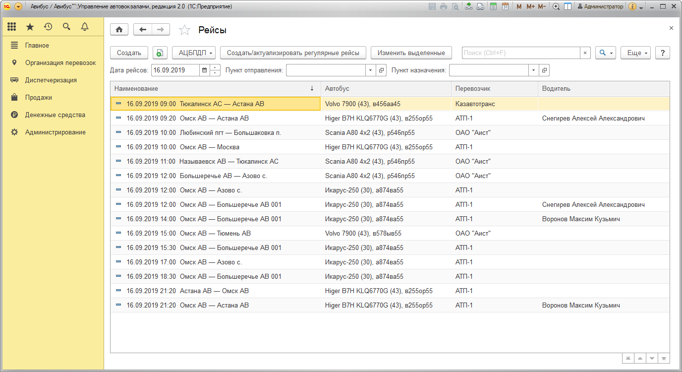 В разделе представлен список рейсов текущего сервера данных, с помощью которого можно просматривать, редактировать регулярные рейсы и создавать нерегулярные.