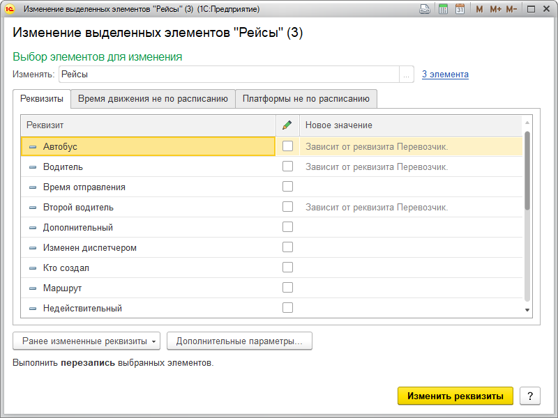 Вносить изменения одновременно в несколько рейсов: для этого выделите нужные рейсы и измените требуемые реквизиты:
