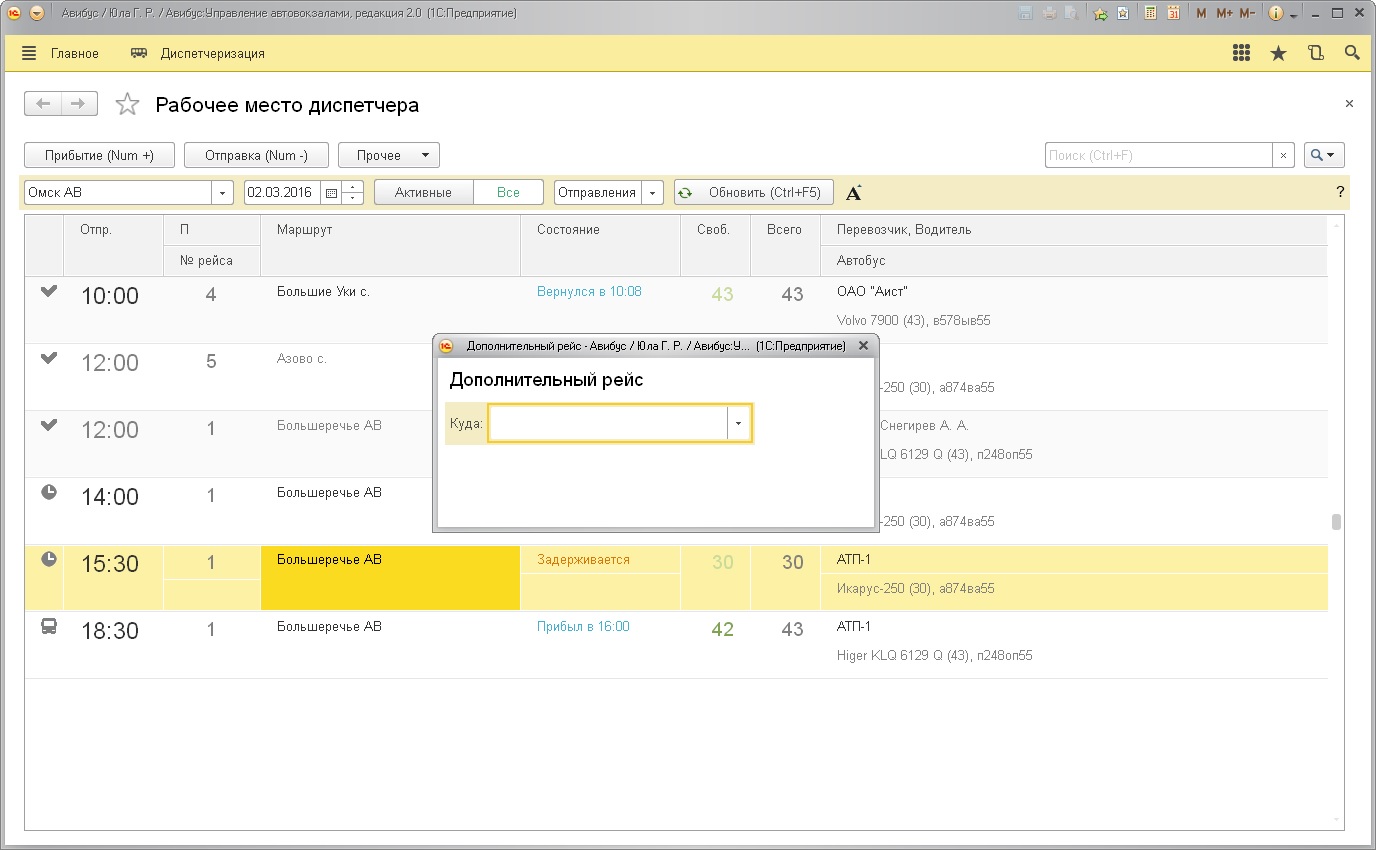 В рабочем месте диспетчера есть возможность создавать дополнительные рейсы по маршруту. Следует отметить, что они создаются с пунктом отправления, указанным в общем списке рейсов.