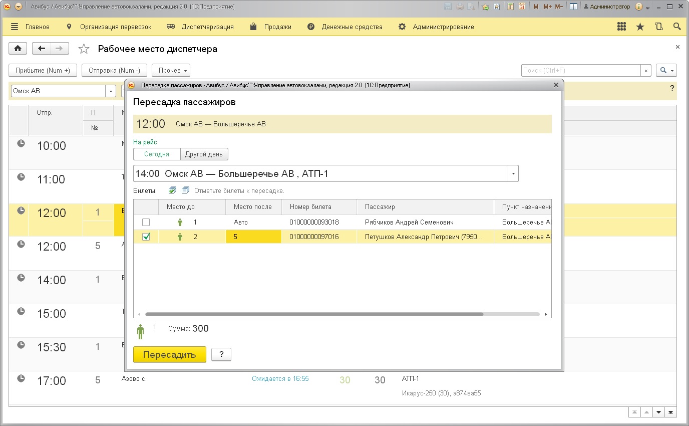 Для пересадки пассажиров необходимо выбрать дату пересадки и рейс-приемник. По умолчанию устанавливается текущая дата, ее можно изменить нажав на кнопку Другой день. Для выбора рейса-приемника программа предлагает рейсы, содержащие остановки рейса-источника. После выбора рейса необходимо выбрать билеты пересаживаемых пассажиров и, при необходимости, указать место в салоне после пересадки. Пересадка багажа не зависит от пассажирских мест и происходит аналогично пересадке пассажиров. Также есть возможность осуществить пересадку забронированных билетов.