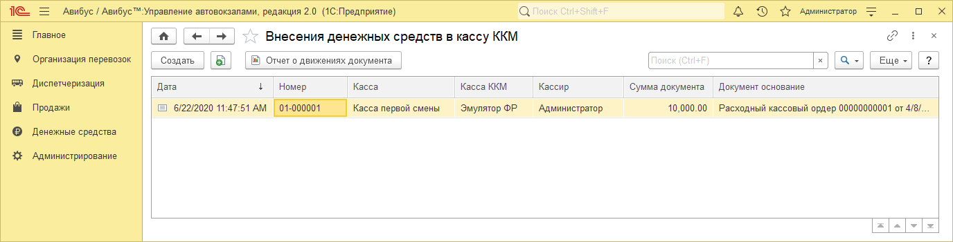 В списке отображены документы внесения денежных средств в кассу ККМ. Документы формируются автоматически в рабочем месте кассира при проведении операции ККМ Внесение наличных.