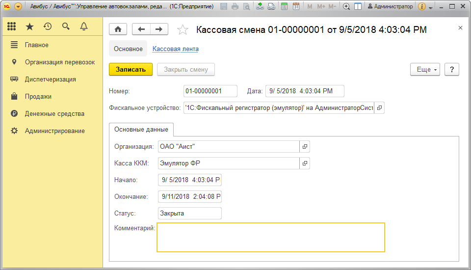 Данные о кассовой смене доступны для просмотра и редактирования. В форме документа в разделе Главное доступна основная информация по смене: