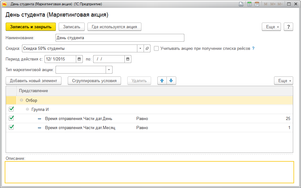Если не добавить ни одного элемента в список условий отбора, акция будет применяться безусловно постоянно.