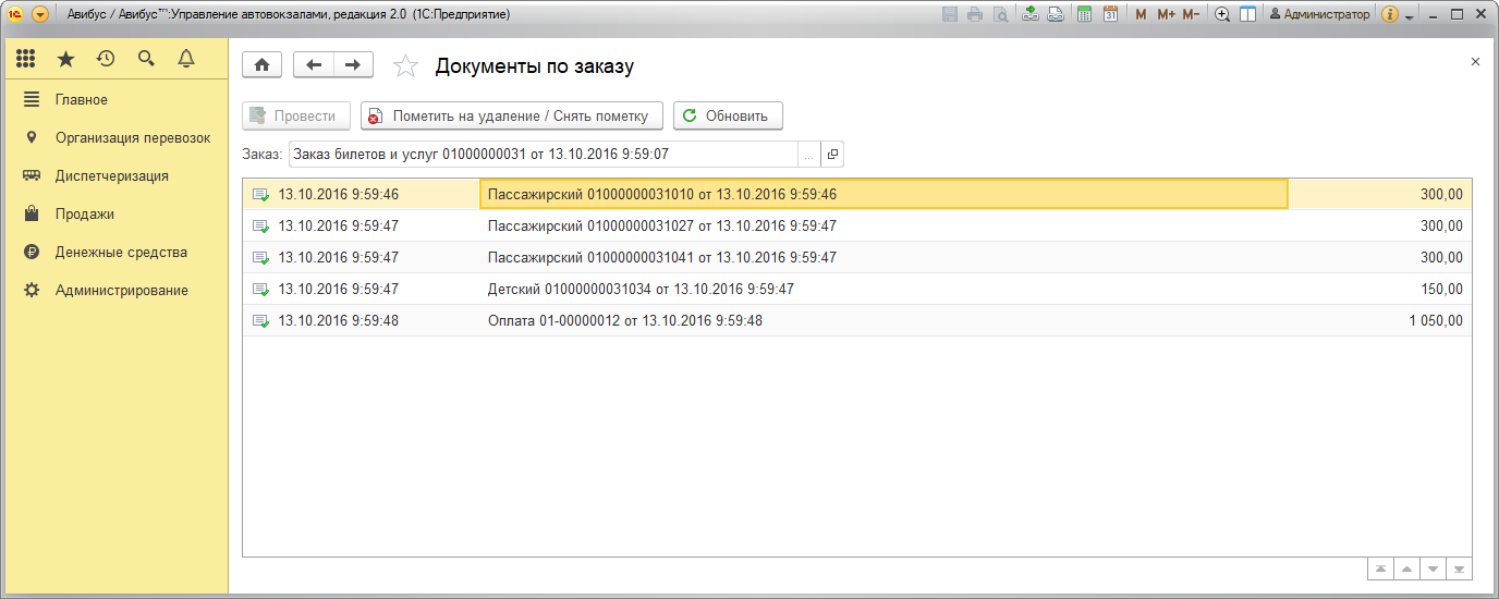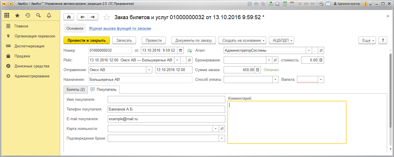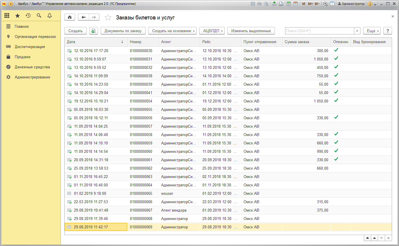 В журнале Заказы формируется информация о каждой начатой продаже билетов или услуг автовокзала. Данные фиксируются даже в том случае, если продажа не была завершена.