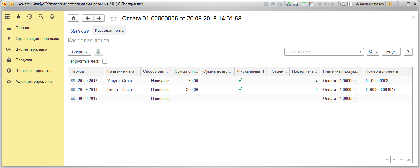 Перейдя по ссылке командной панели Кассовая лента можно просмотреть чеки, относящиеся к текущему документу оплаты, подробнее – в разделе Кассовая лента.