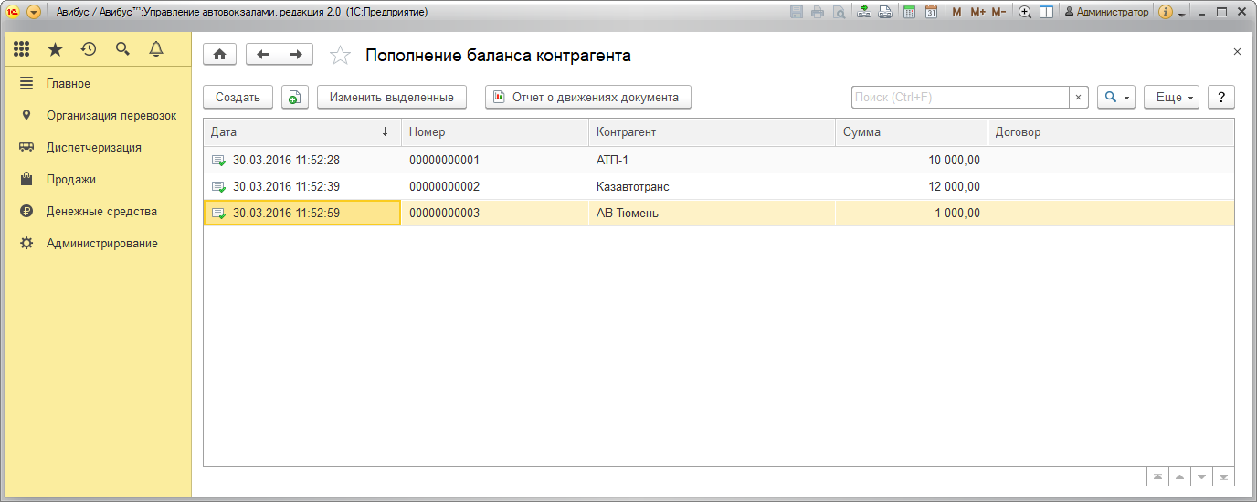В журнале Пополнение баланса контрагента содержатся документы, фиксирующие пополнение баланса контрагента: