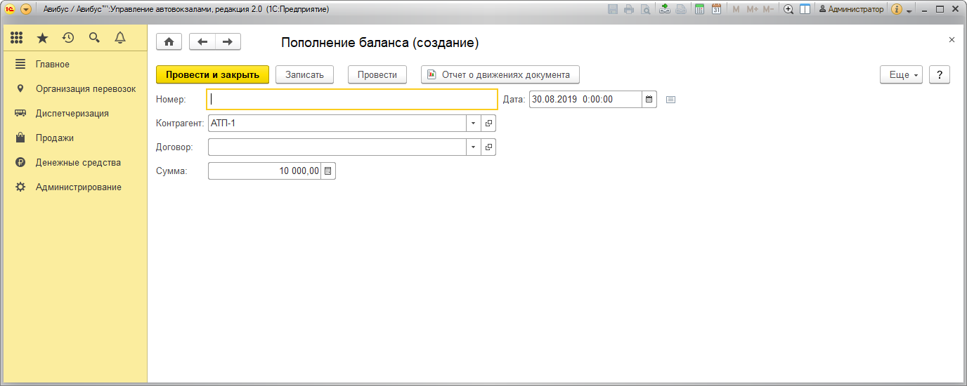 Для создания документа укажите контрагента и сумму, на которую пополняется его баланс. Номер и дата документа заполняются автоматически: