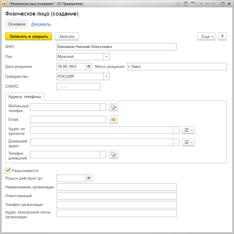 На вкладке Основное для каждого физического лица можно указать его личные данные: