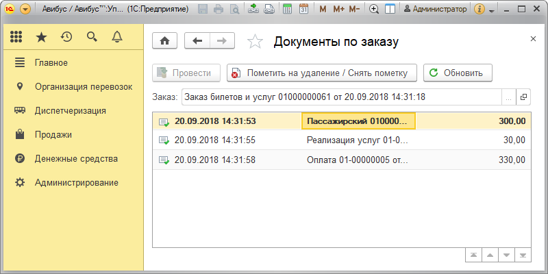 Просмотреть, к какому документу Заказ билетов и услуг относится текущий билет, подробнее – в разделе Заказы. В списке отображаются все документы, относящиеся к этому заказу, текущий билет выделен жирным шрифтом: