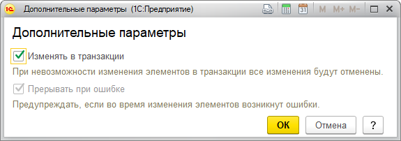 • Изменять в транзакции (по умолчанию флаг установлен) – программа позволяет обрабатывать выбранные для изменения элементы списка в транзакции. Если в процессе записи при установленном флаге не удается записать один из объектов (например, потому что объект редактируется другим пользователем), то будут отменены изменения во всех выбранных объектах.