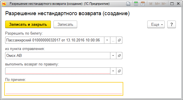 По ссылке Разрешения нестандартных возвратов можно задать способы возвратов билетов, отличающиеся от разрешенных кассирам: для разрешения возврата необходимо выбрать причину разрешения возврата и добавить ее описание (к примеру, ответственный сотрудник может разрешить возврат по причине болезни пассажира только в ручном режиме под личную ответственность).