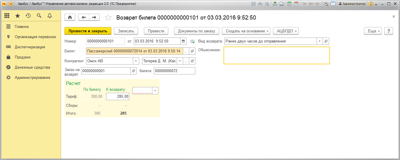 На форме Возврата билета доступна основная информация: номер и дата возврата билета, билет, контрагент, вид возврата и т.д., а также сводная информация о денежных средствах, подлежащих возврату: