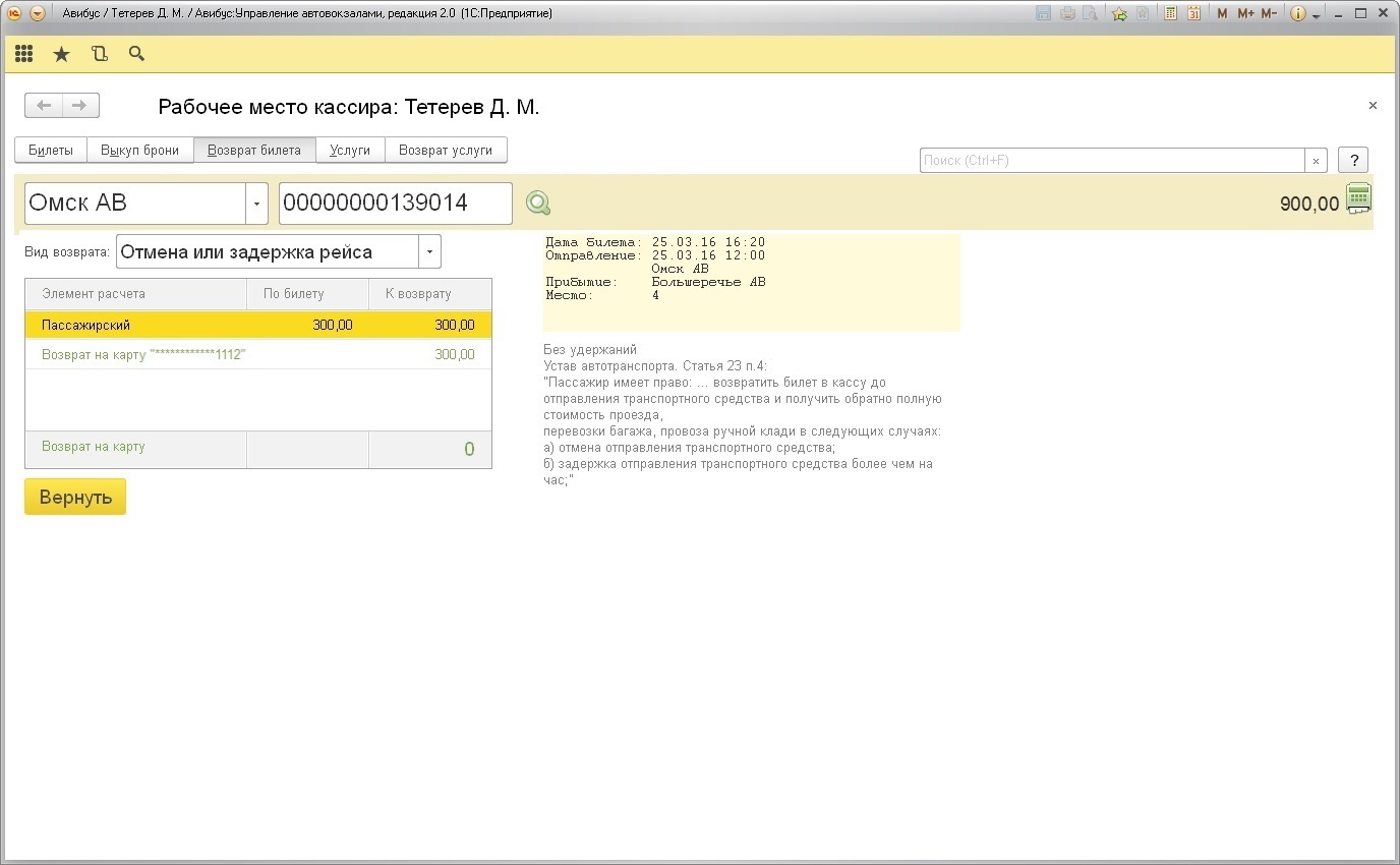 В табличной части формы отображается информация о карте, с которой были списаны денежные средства на оплату билета, и сумма к возврату.