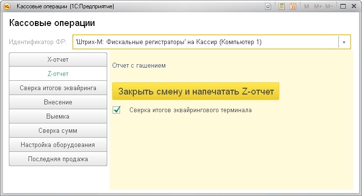 Для этого должен быть установлен флаг Сверка итогов эквайрингового терминала в разделе Кассовые операции → Z-отчет, который доступен в РМК по клику на иконку ККМ