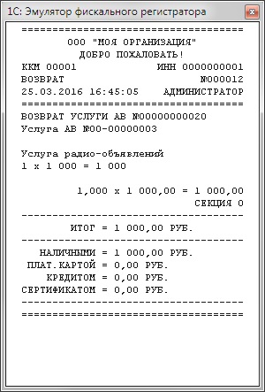 После нажатия на кнопку будет произведен возврат денежных средств за услуги и распечатан чек.