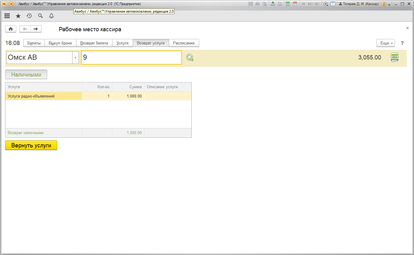 Возврат средств за проданные услуги, не связанных непосредственно с автоперевозками, осуществляется в режиме Возврат услуг рабочего места кассира.