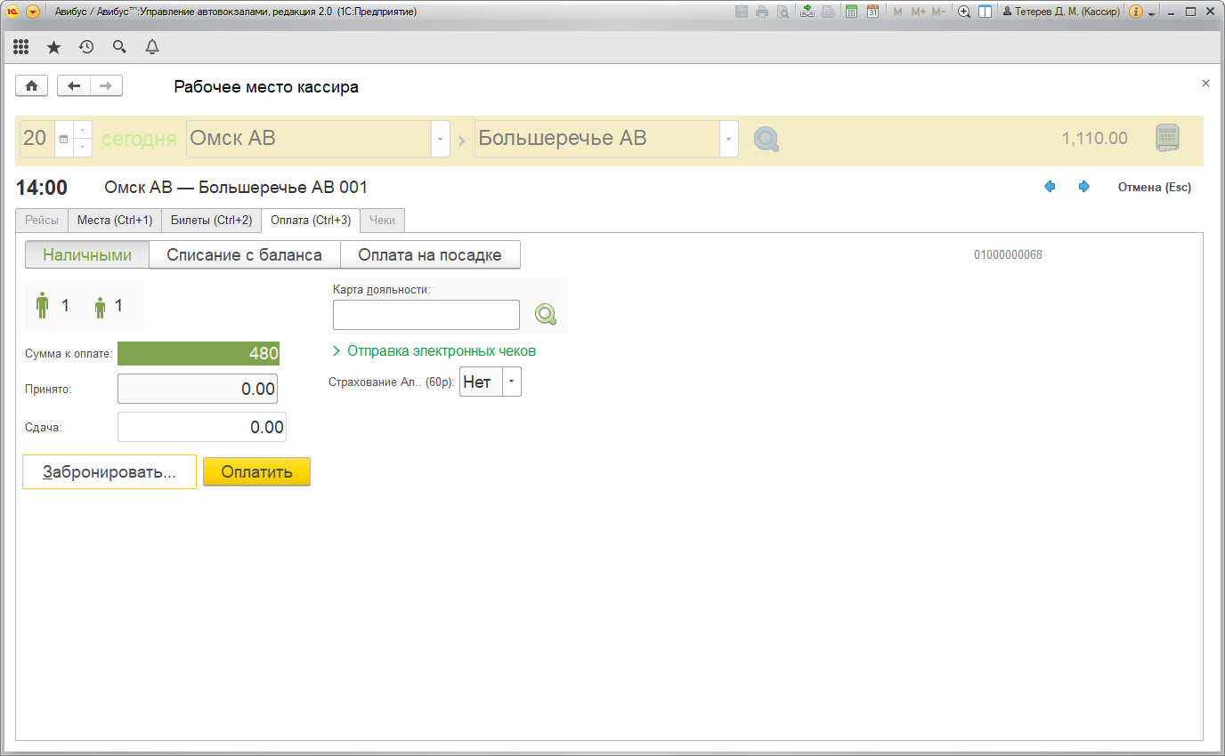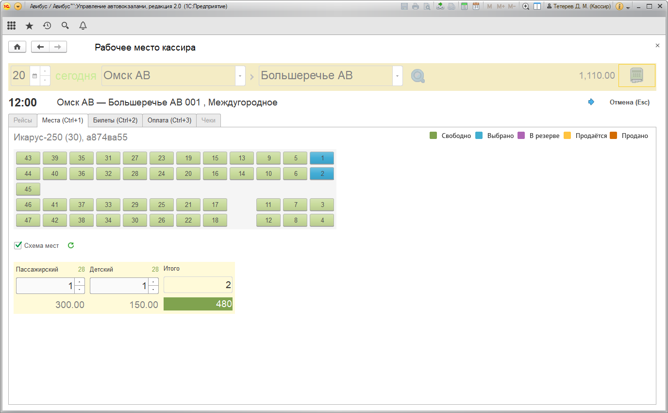 После того как заказ будет найден, процедура продажи продолжится с этапа выбора мест. Все заполненные при бронировании персональные данные сохраняются. Во вкладке Места будут отмечены зарезервированные билеты. На форме можно добавлять билеты к заказу. Если данные верны, перейдите к оплате заказа.