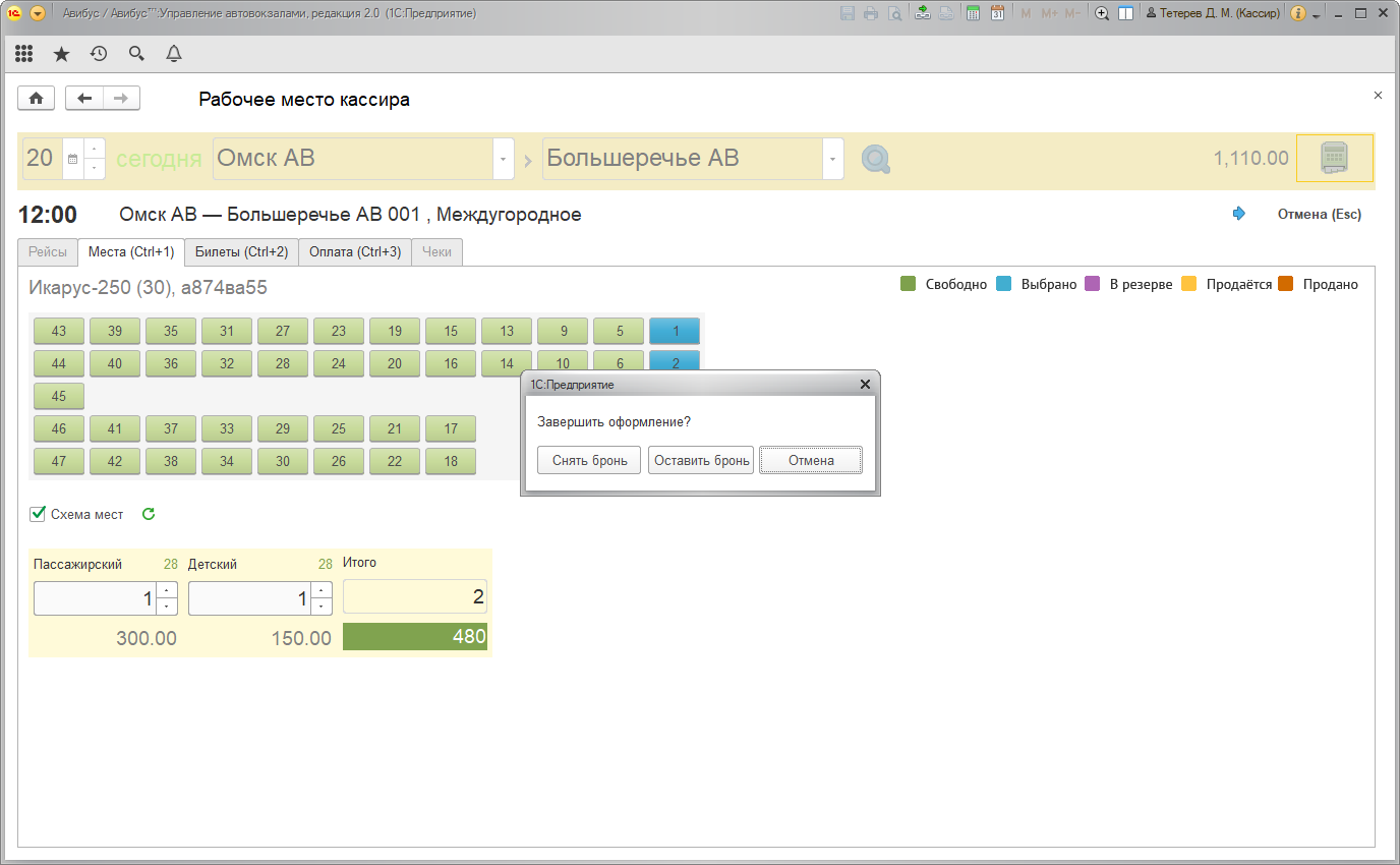 Процесс бронирования билетов осуществляется в режиме Билеты рабочего места кассира и аналогичен покупке вплоть до этапа оплаты.