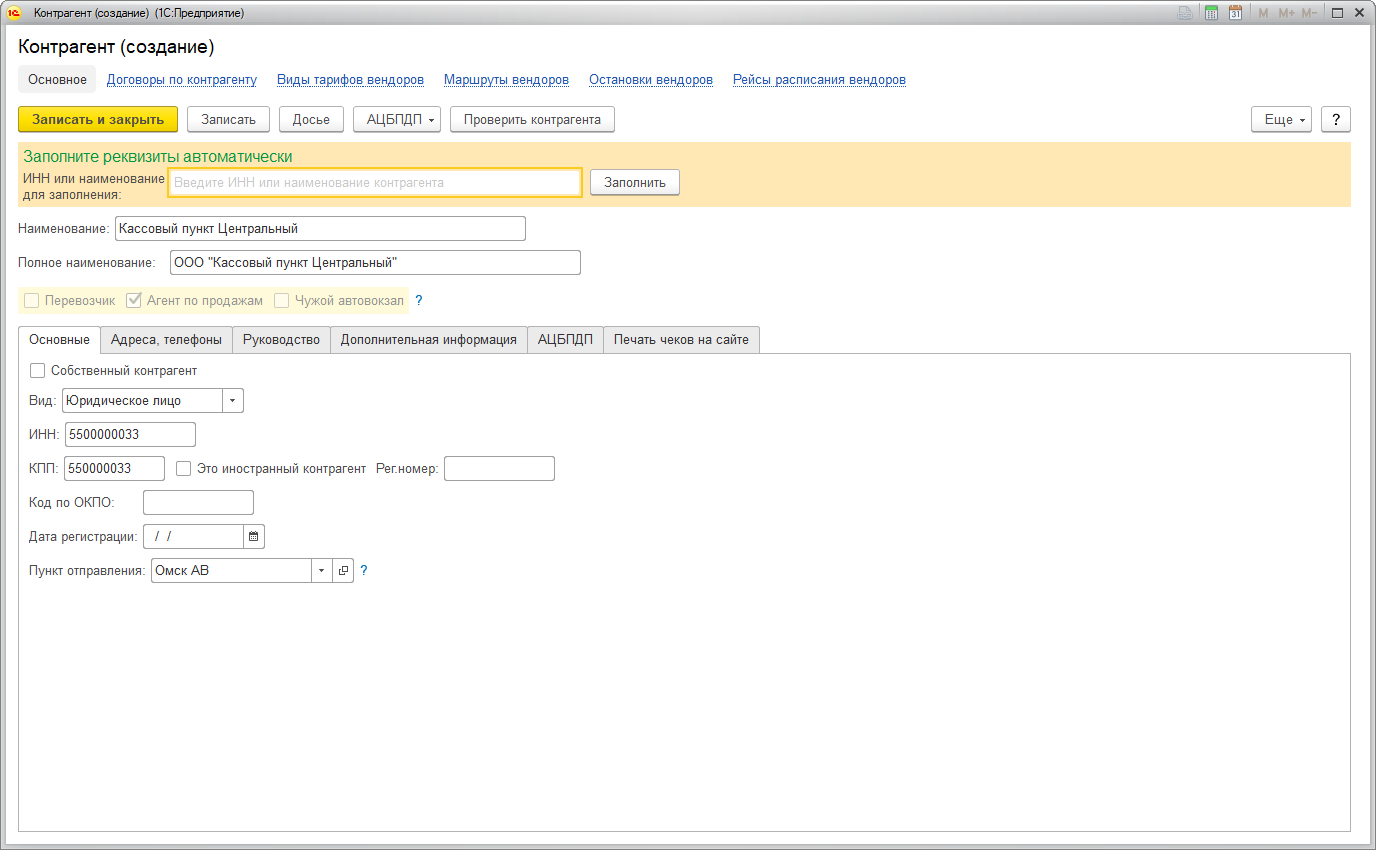Начните создание агента по продаже билетов с заполнения основной информации о нем в разделе Основное окна Контрагент (создание). Подробно данный этап описан в разделе Создание перевозчика.