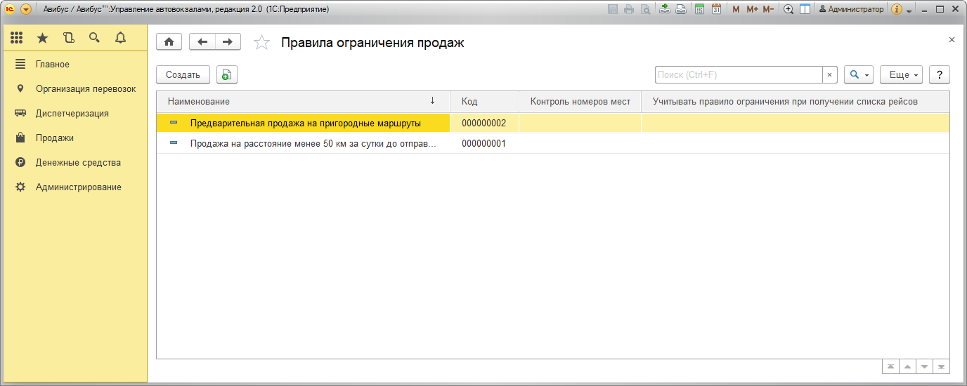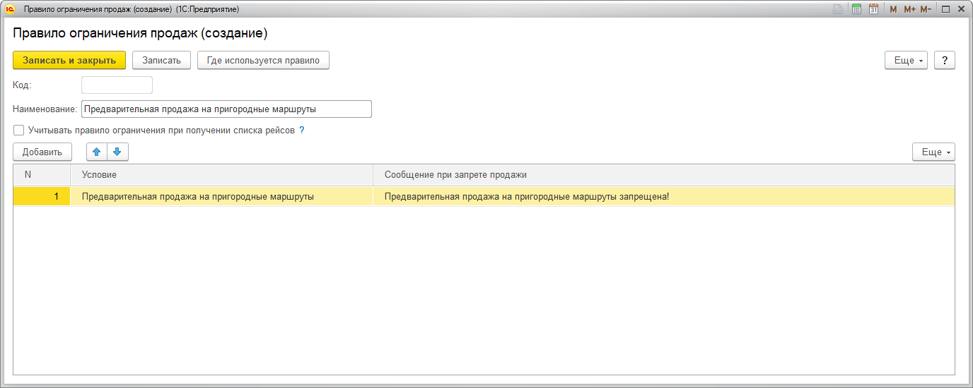 Правила ограничения продаж – справочник правил, ограничивающих продажи при выполнении определенных условий (например, запрет предварительной продажи на пригородные маршруты).