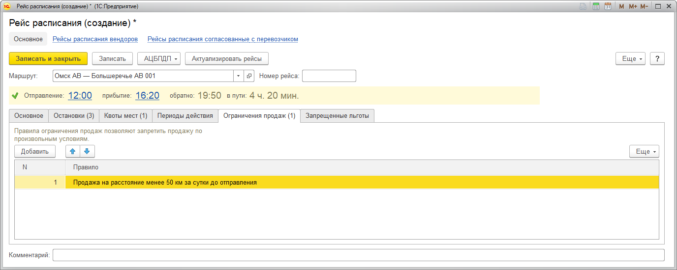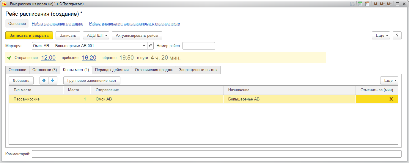 В открывшемся окне Рейс расписания (создание) выберите маршрут и заполните необходимую информацию: