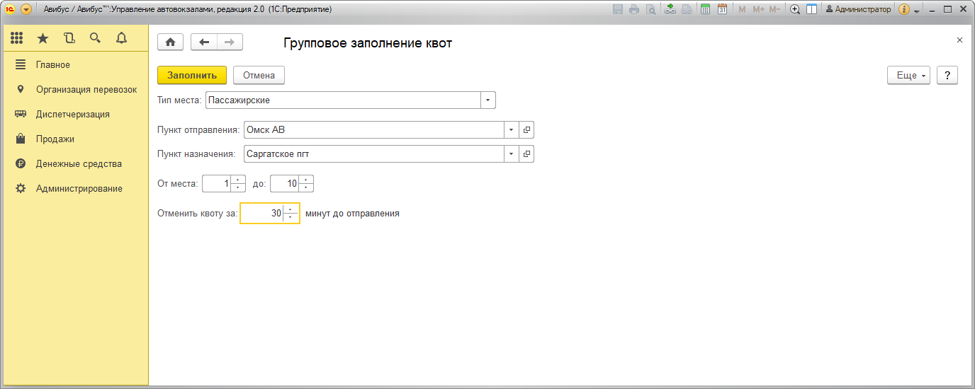 Отменить за (мин.) : определите, за какое время до отправления квота будет отменена и посадочное место станет доступно для продажи. Если поле не заполнено, квота не будет отменена;