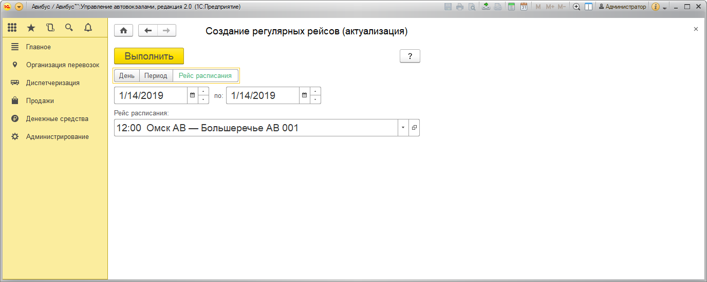По рейсам расписания ежедневно автоматически создаются регулярные рейсы на определенный день при помощи регламентного задания. Регламентное задание автоматически создает рейсы, доступные для предварительной продажи, в соответствии с настройкой Глубины предварительной продажи. Также возможна ручная актуализация рейсов по выбранному расписанию из формы Маршрута → вкладка Расписание.