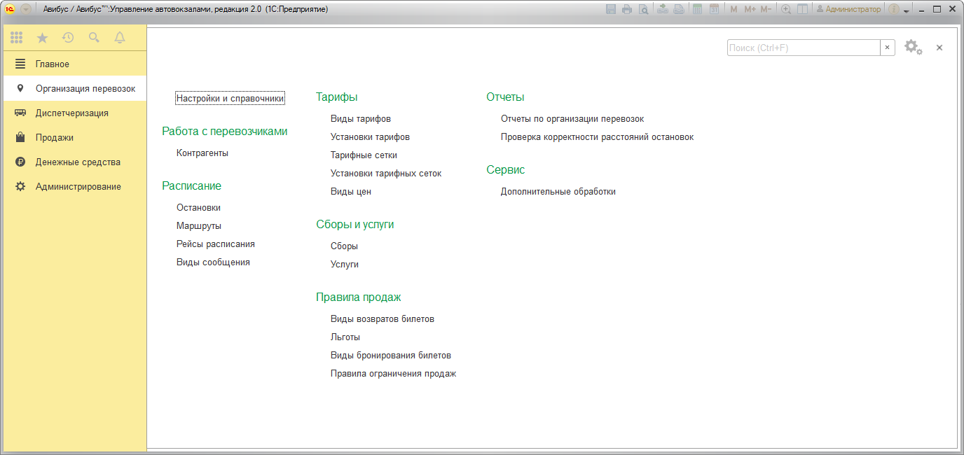 В разделе Организация перевозок содержатся все необходимые инструменты для создания расписания, контрагентов, льгот и услуг, установки стоимости проезда, определения сборов автовокзала и правил продаж. Также в разделе можно формировать отчеты по организации перевозок.