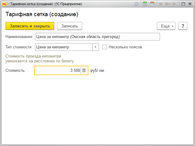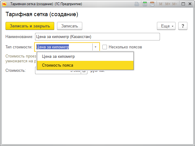 Если тип стоимости определен как Цена за километр, то необходимо задать стоимость в рублях каждого километра для каждого определенного пояса, а если тип стоимости определен как Стоимость пояса, то необходимо задать стоимость в рублях каждого определенного пояса целиком.
