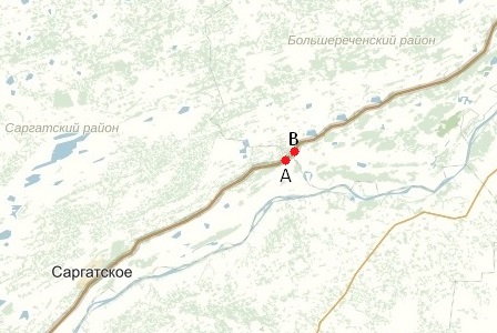 Маршрут проходит через Саргатский и Большеречнский район. Остановка А является границей Саргатского района, а остановка В – границей Большереченского района.